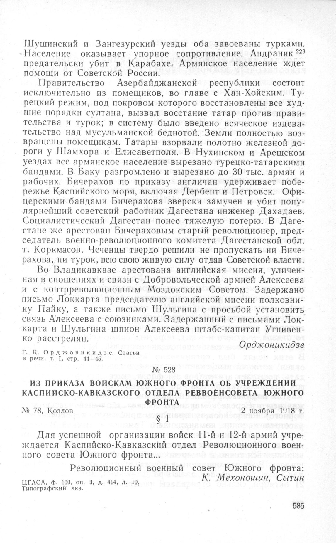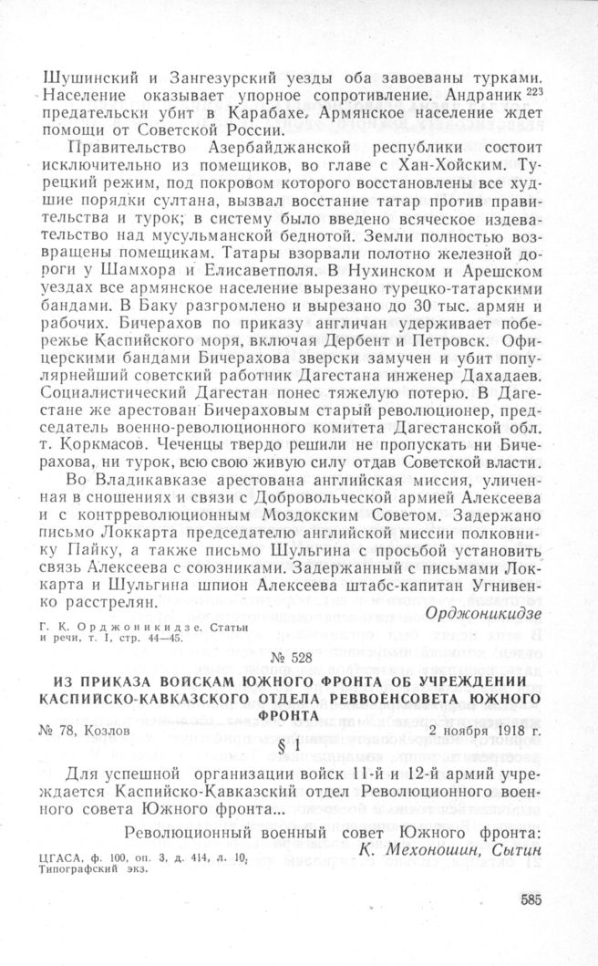 Из приказа войскам Южного фронта об учреждении Каспийско-Кавказског...