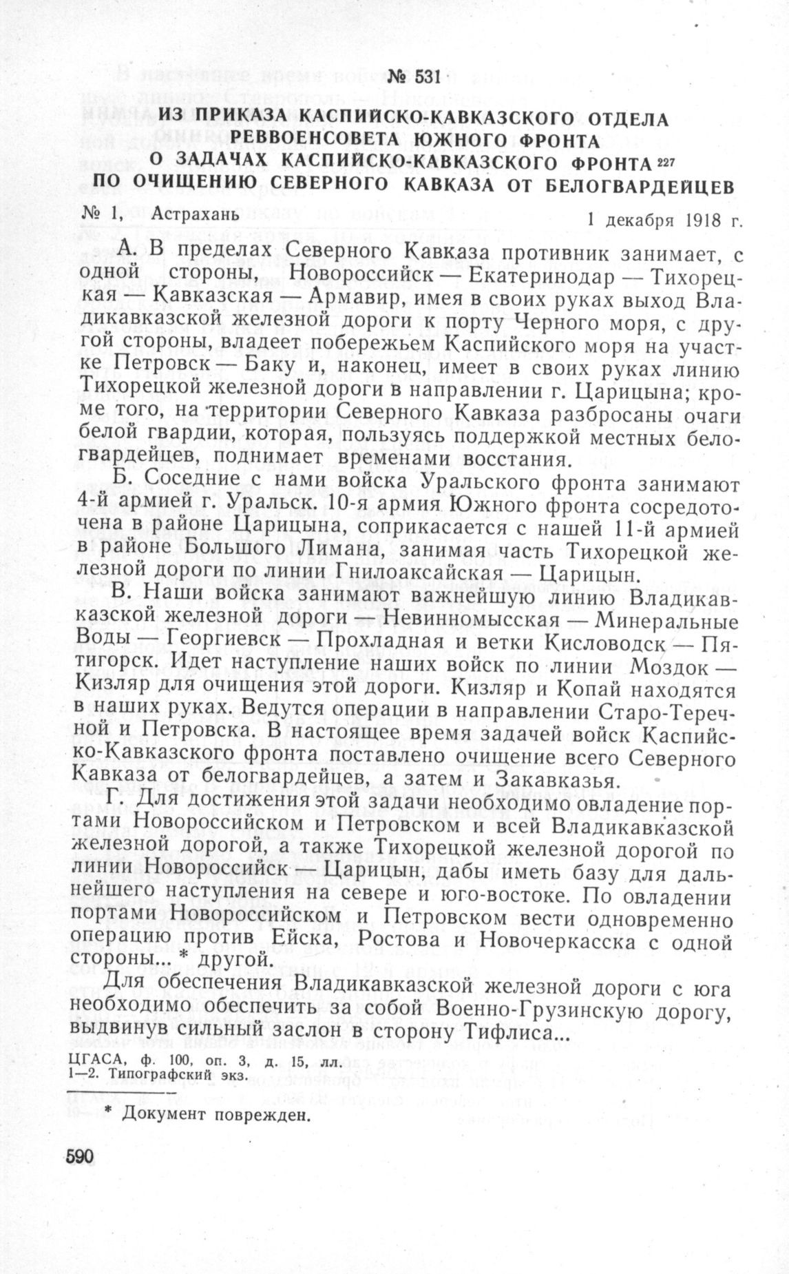 Из приказа Каспийско-Кавказского отдела Реввоенсовета Южного фронта о задачах Каспийско-Кавказского фронта по очищению Северного Кавказа от белогвардейцев. Астрахань, 1 декабря 1918 г. // ЦГАСА, ф. 100, оп. 3, д. 15, лл. 1-2. Типографский экз.
