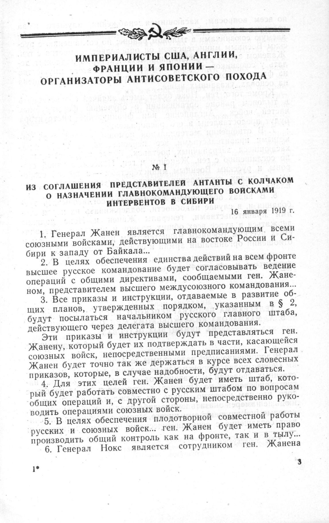 Из соглашения представителей Антанты с Колчаком о назначении главнокомандующего войсками интервентов в Сибири. 16 января 1919 г. // «Кто должник?» Сб. документированных статей. М., 1926, стр. 551-552.