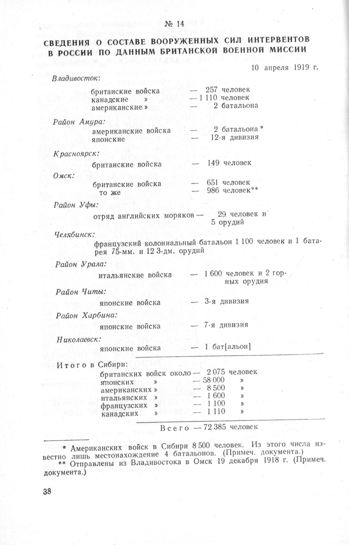 Сведения о составе вооруженных сил интервентов в России по данным Британской военной миссии. Владивосток, 10 апреля 1919 г. // ЦГАОР СССР, ф. 449. oп. 1, д. 1, лл. 154-155. Копия.