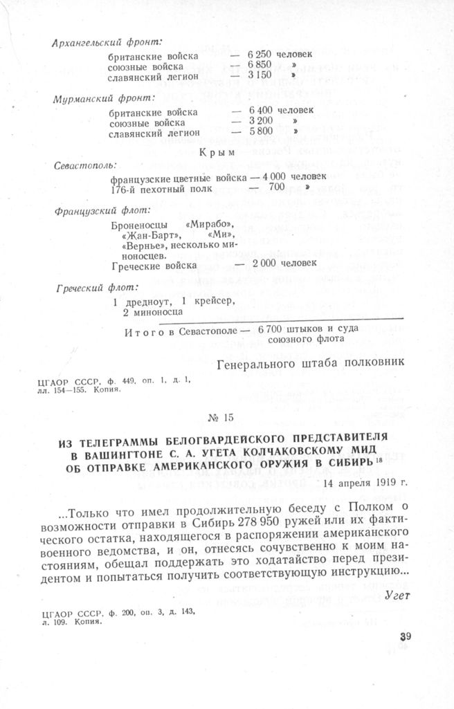 Из телеграммы белогвардейского представителя в Вашингтоне С.А. Угета колчаковскому МИД об отправке американского оружия в Сибирь. 14 апреля 1919 г. // ЦГАОР СССР, ф. 200, оп. 3, д. 143. л. 109. Копия.