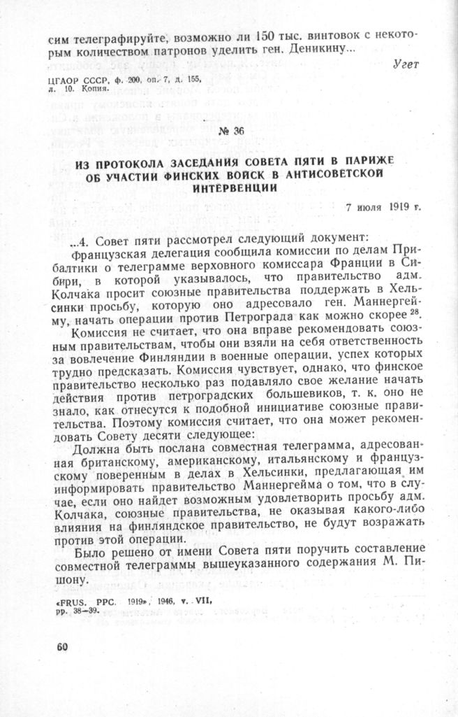 Из протокола заседания Совета Пяти в Париже об участии финских войск в антисоветской интервенции. 7 июля 1919 г. // «FRUS. РРС. 1919», 1946, V. VII, рр. 38-39.
