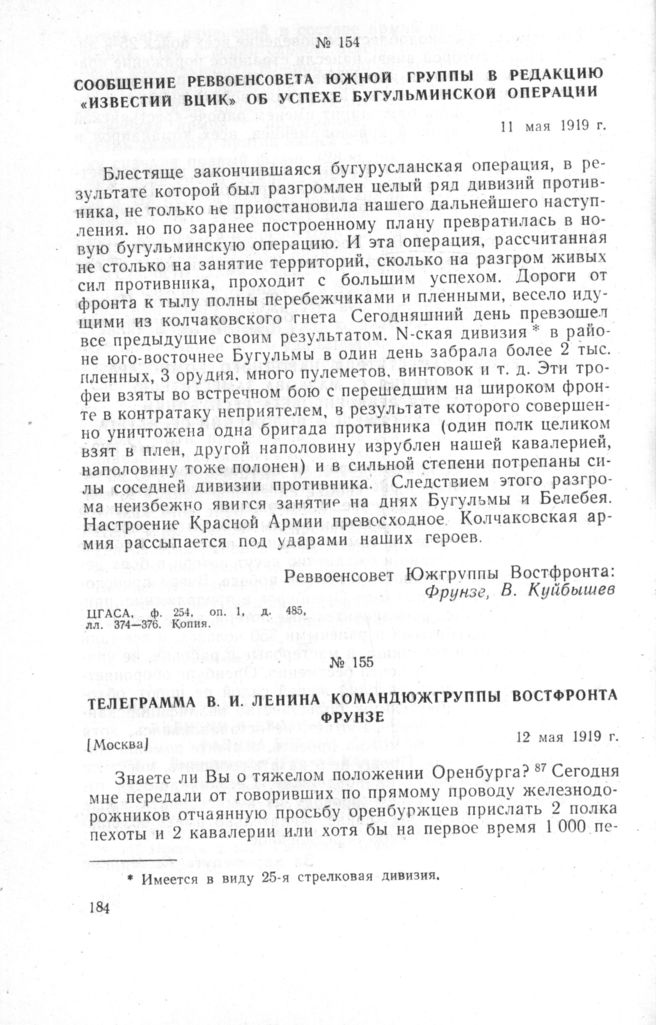 Телеграмма В.И. Ленина Командюжгруппы Востфронта Фрунзе. [Москва], 12 мая 1919 г. // В.И. Ленин. Военная переписка (1917-1920). М., 1956, стр. 119.