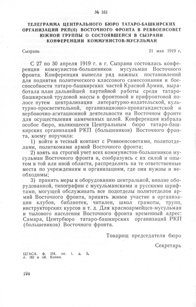 Телеграмма Центрального бюро татаро-башкирских организаций РКП(б) Восточного фронта в Реввоенсовет Южной группы о состоявшейся в Сызрани конференции коммунистов-мусульман. Сызрань, 21 мая 1919 г. // ЦГАСА, ф. 254, oп. 1, д. 5, л. 182 и об. Копия.