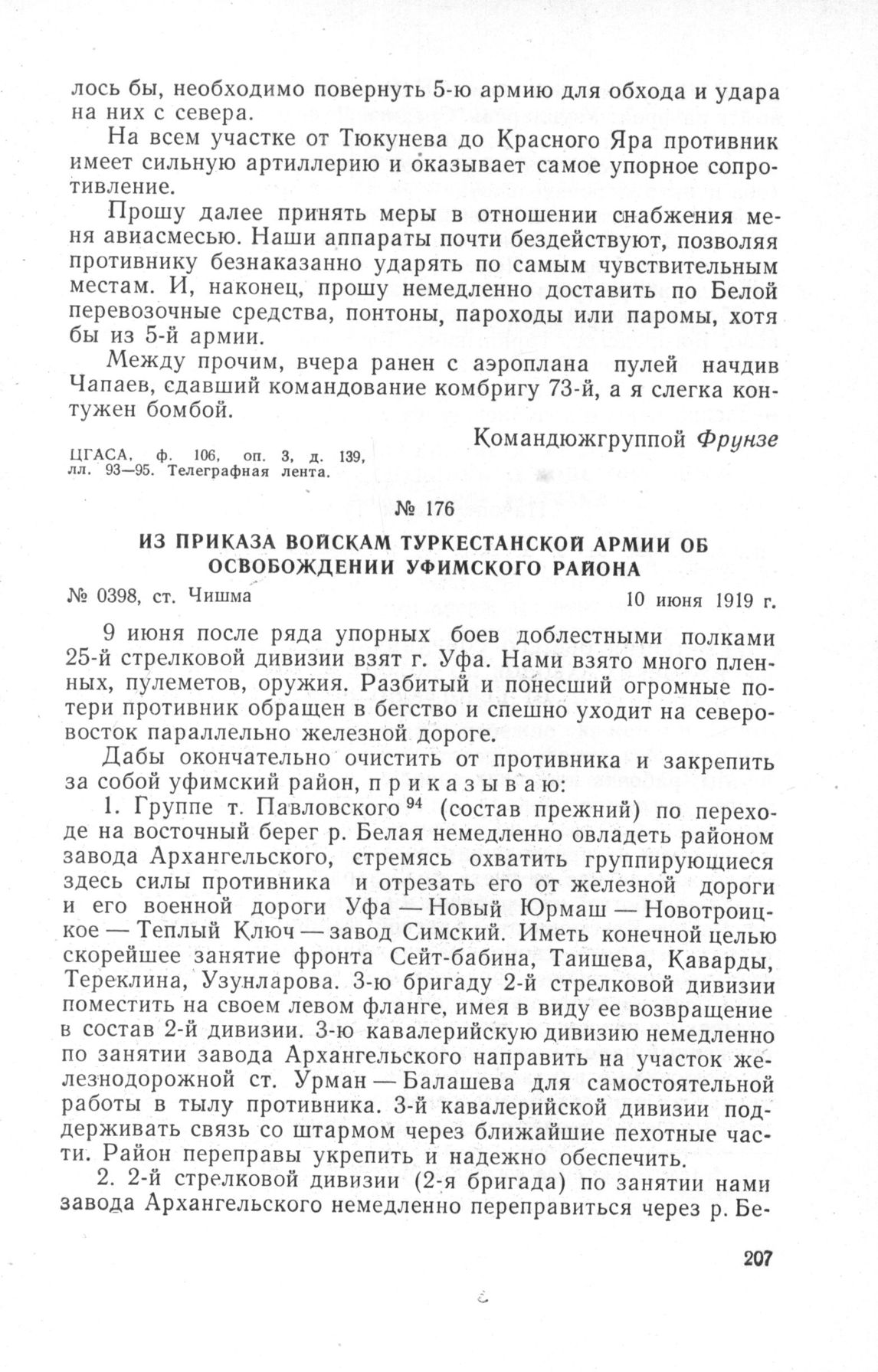 Из приказа войскам Туркестанской армии об освобождении Уфимского района. ст. Чишма, 10 июня 1919 г. // ЦГАСА, ф. 238, оп. 3, д. 23, лл. 101-102. Подлинник. Опубл. в кн. М.В. Фрунзе «Избранные произведения». М., 1957, т. 1, стр. 201-203.
