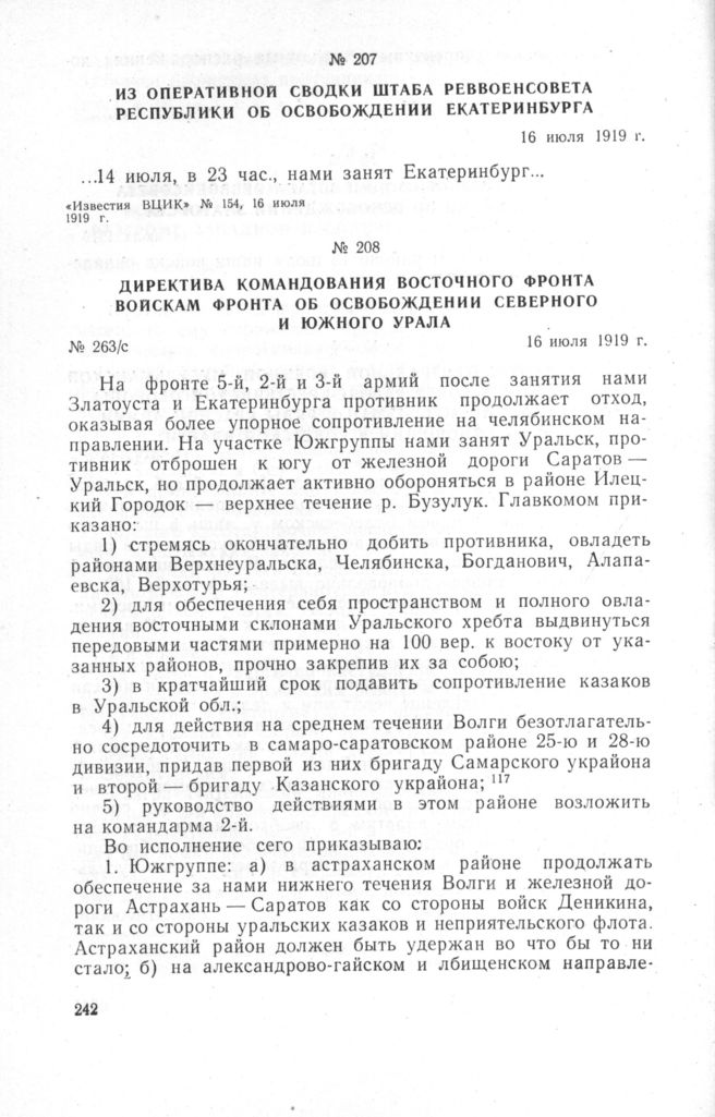 Директива командования Восточного фронта войскам фронта об освобождении Северного и Южного Урала. 16 июля 1919 г. // ЦГАСА, ф. 106, оп. 3, д. 172, лл. 32-38. Подлинник.