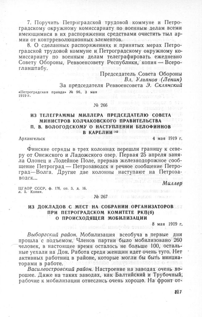 Из докладов с мест на собрании организаторов при Петроградском комитете РКП(б) о происходящей мобилизации. 8 мая 1919 г. // «Борьба пролетариата». Ученые записки Ленинградского института истории ВКП(б) № 3, 1941, стр. 206-207.