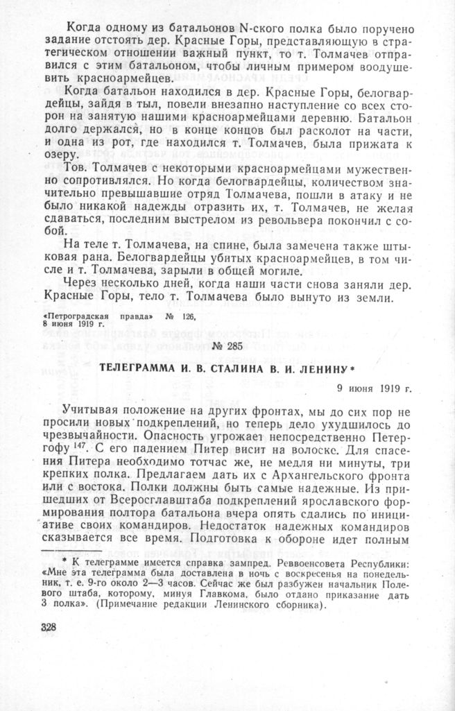 Телеграмма И.В. Сталина В.И. Ленину. 9 июня 1919 г. // Ленинский сборник XXXIV, стр. 167.