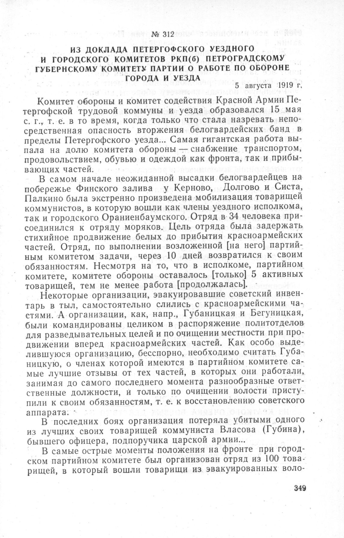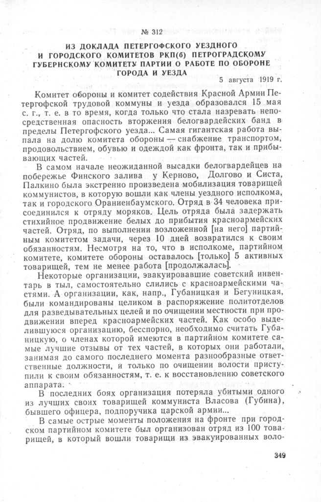 Из доклада Петергофского уездного и городского комитетов РКП(б) Петроградскому губернскому комитету партии о работе по обороне города и уезда. 5 августа 1919 г. // «Борьба пролетариата». Ученые записки Ленинградского института истории ВКП(б) № 3, 1941, стр. 222-224.