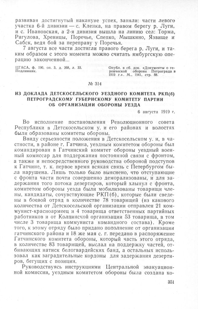 Из доклада Детскосельского уездного комитета РКП(б) Петроградскому губернскому комитету партии об организации обороны уезда. 6 августа 1919 г. // «Борьба пролетариата». Ученые записки Ленинградского института истории ВКП(б) № 3, 1941, стр. 224-225.