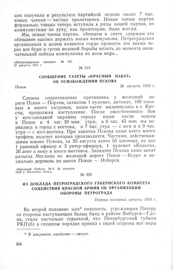 Сообщение газеты «Красный Набат» об освобождении Пскова. Псков, 26 августа 1919 г. // «Красный Набат» № 9, 28 августа 1919 г. Великие Луки.