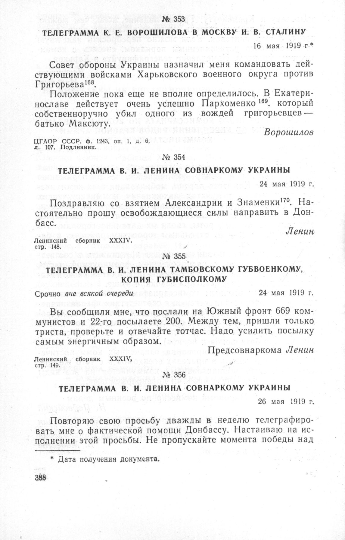 Телеграмма К.Е. Ворошилова в Москву И.В. Сталину. 16 мая 1919 г. // ЦГАОР СССР. ф. 1243, oп. 1, д. 6, л. 107. Подлинник.