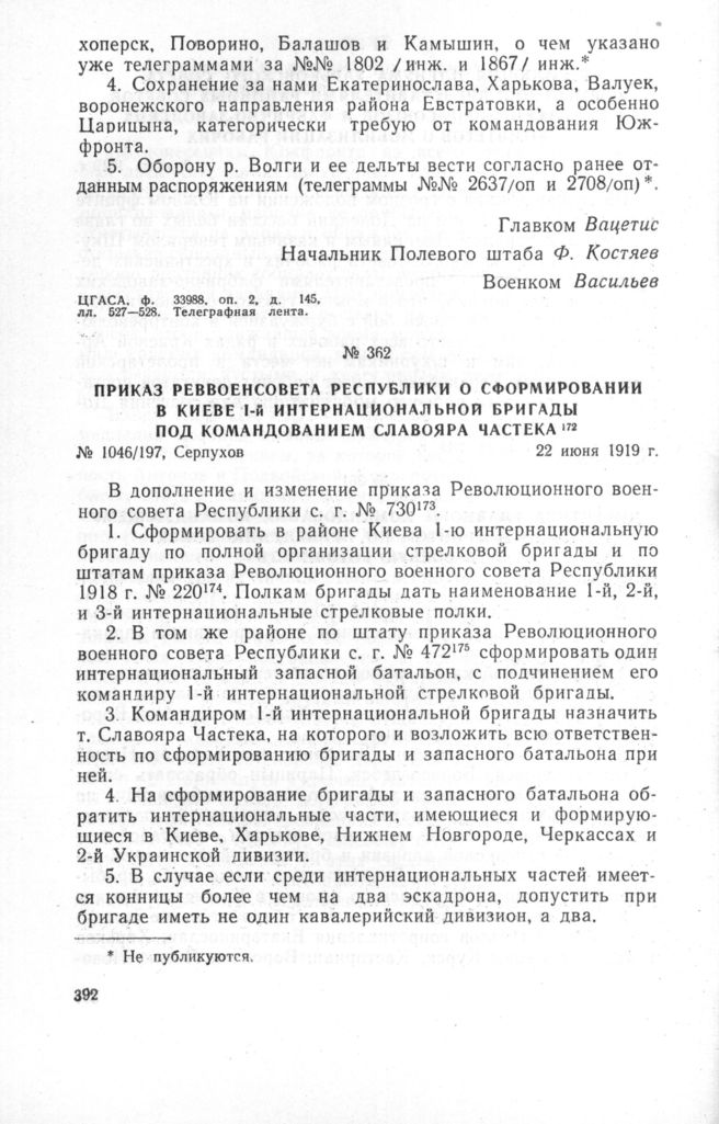 Приказ Реввоенсовета Республики о сформировании в Киеве 1-й интернациональной бригады под командованием Славояра Частека. Серпухов, 22 июня 1919 г. // ЦГАСА. ф. 33988, оп. 2, д. 44, л. 140. Заверенная копия.