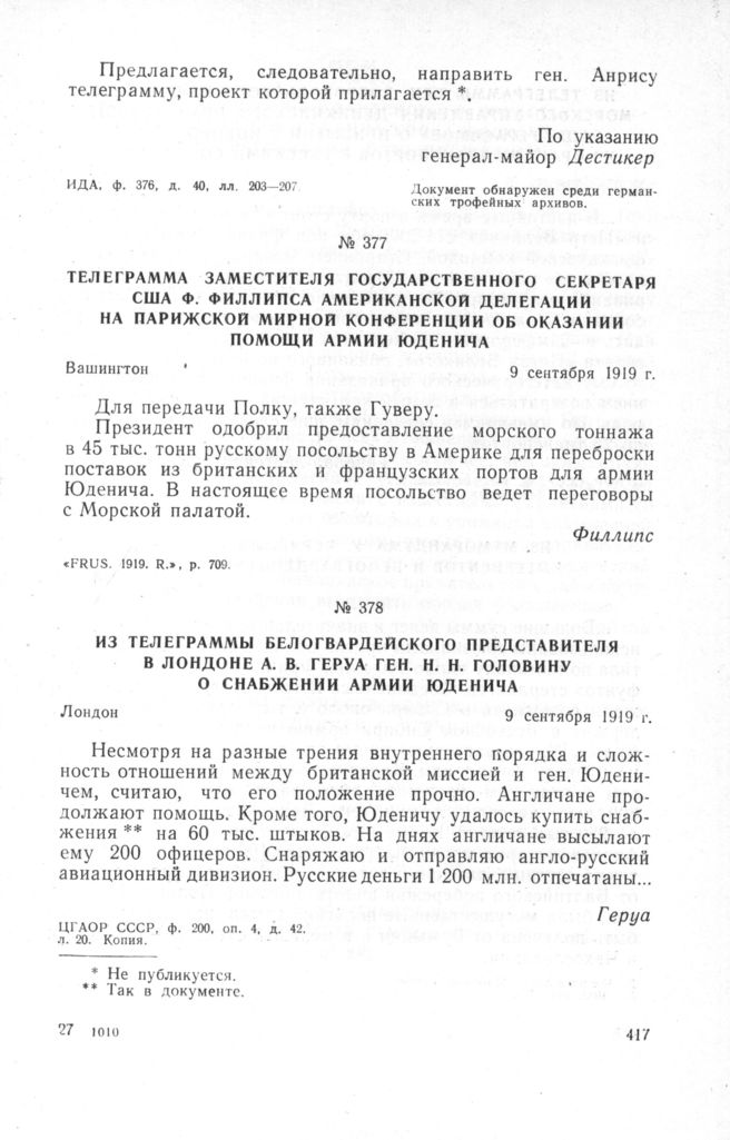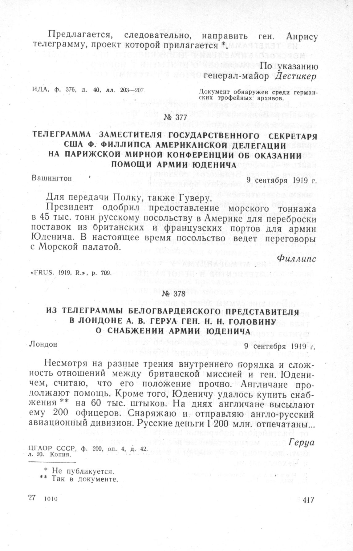 Телеграмма заместителя Государственного Секретаря США Ф. Филлипса американской делегации на Парижской мирной конференции об оказании помощи армии Юденича. Вашингтон, 19 сентября 1919 г. // «FRUS. 1919. R.», р. 709.