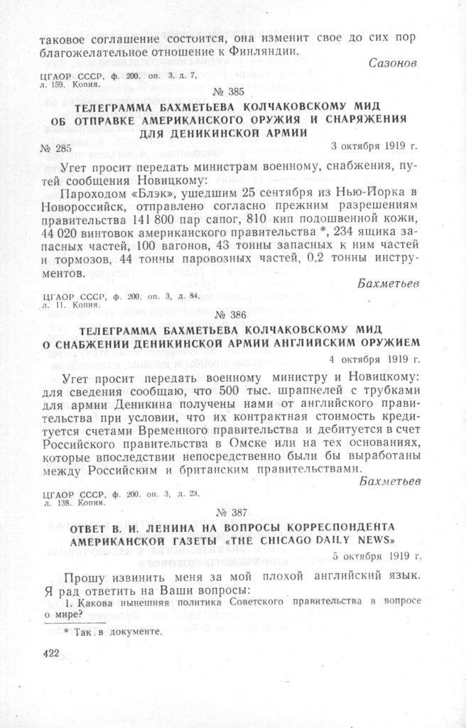 Телеграмма Бахметьева колчаковскому МИД о снабжении деникинской армии английским оружием. 4 октября 1919 г. // ЦГАОР СССР, ф. 200. оп. 3, д. 23, л. 138. Копия.