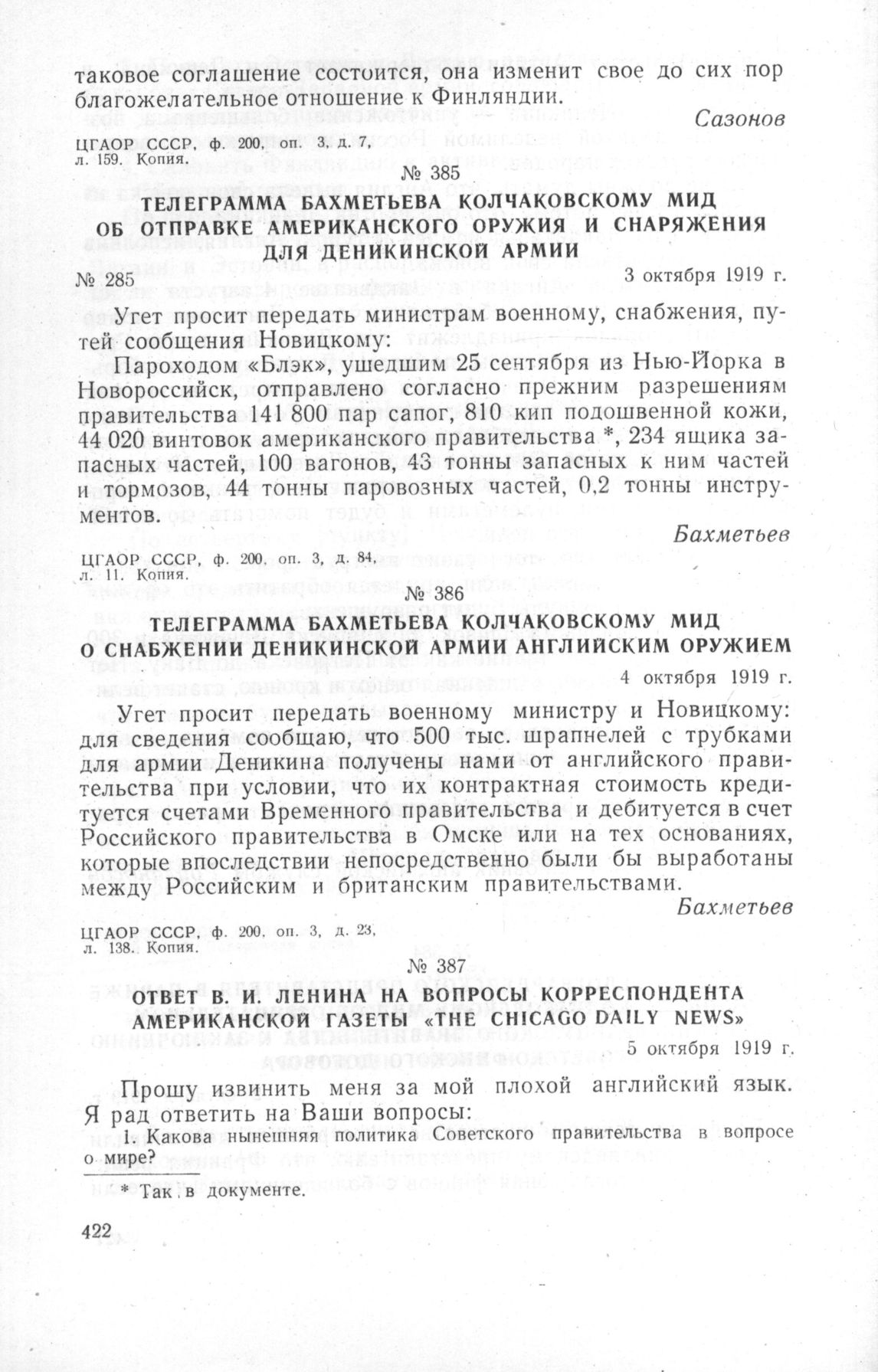 Ответ В.И. Ленина на вопросы корреспондента американской газеты «The Chicago Daily News». 5 октября 1919 г. // В.И. Ленин. Соч., т. 30, стр. 32-33.