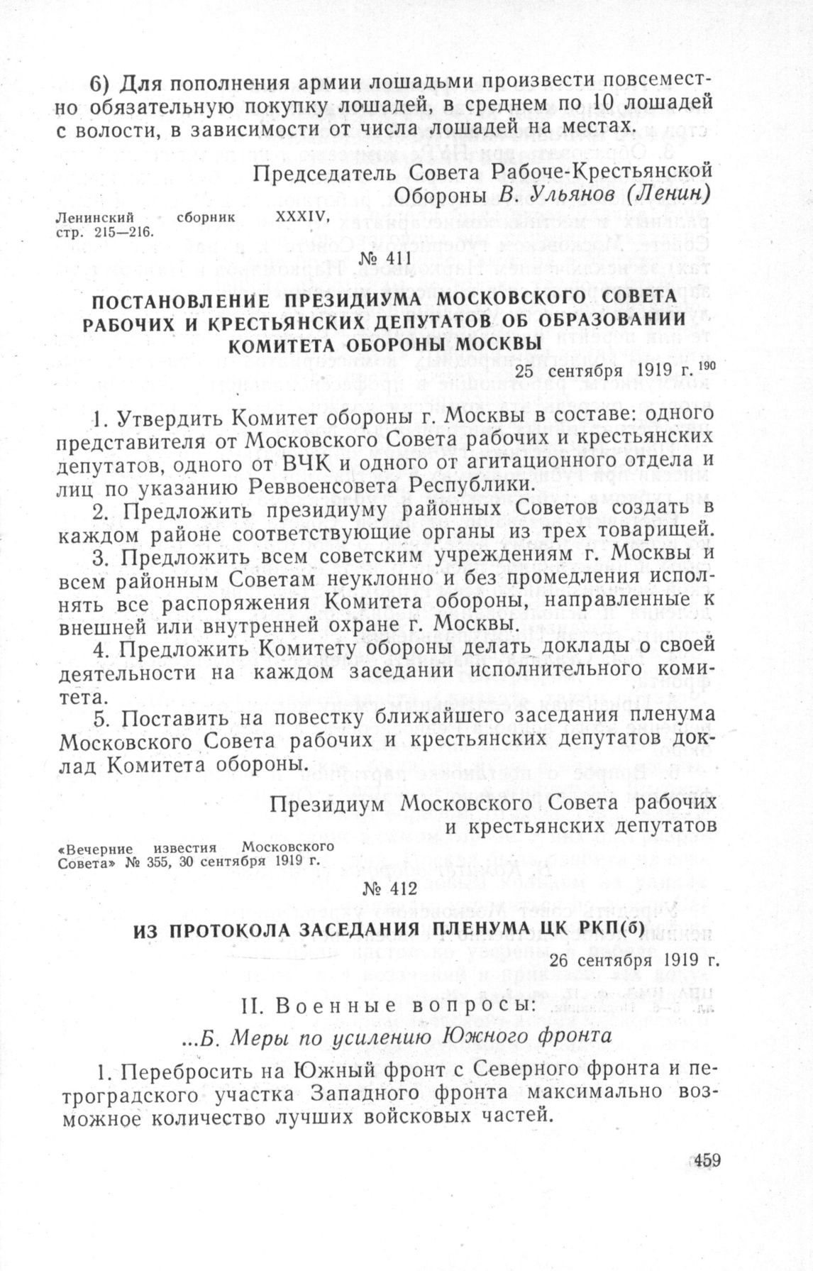 Постановление Президиума Московского Совета рабочих и крестьянских депутатов об образовании Комитета Обороны Москвы. 25 сентября 1919 г. // «Вечерние известия Московского Совета» № 355, 30 сентября 1919 г.
