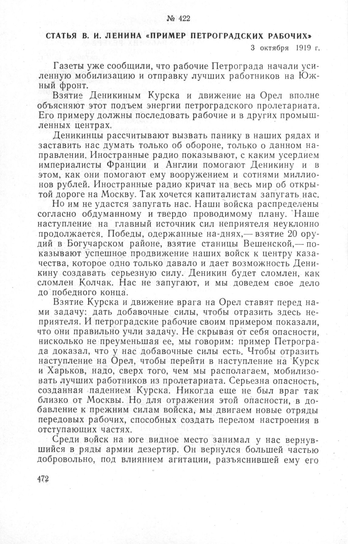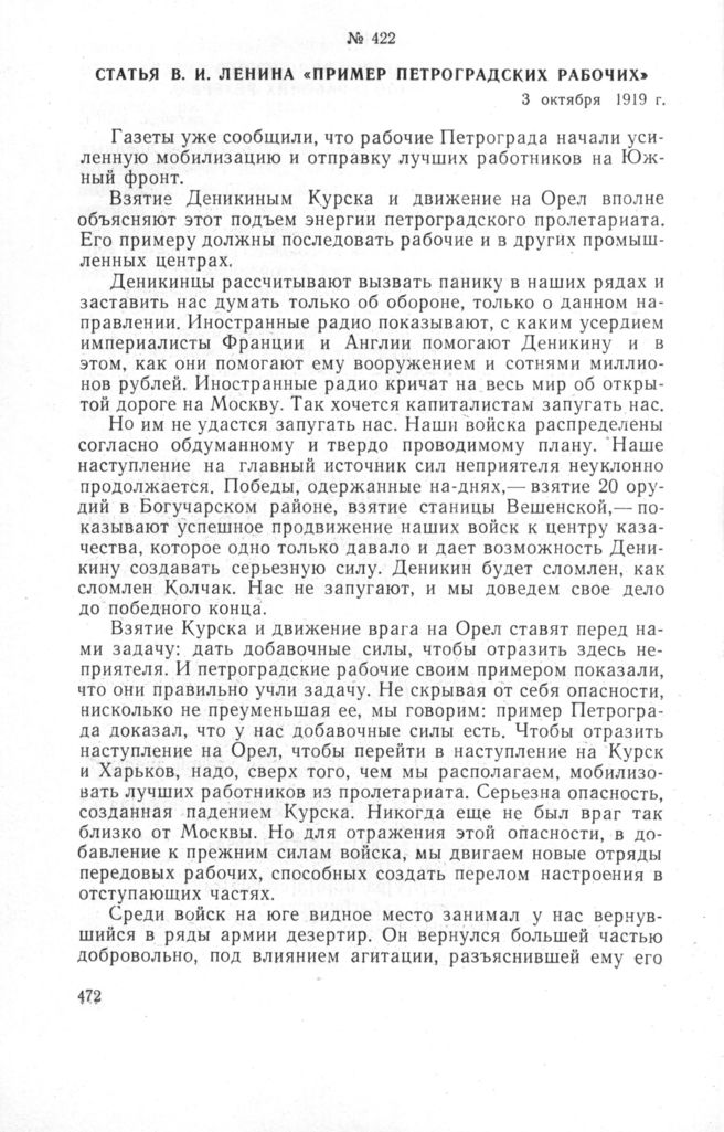 Статья В.И. Ленина «Пример петроградских рабочих». 3 октября 1919 г.
