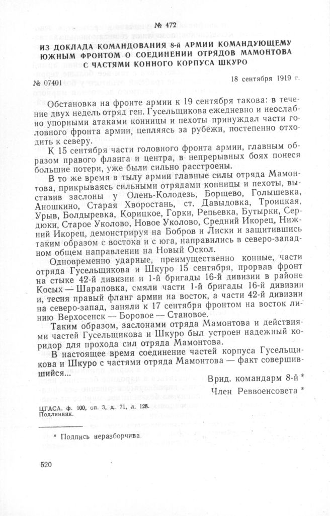 Из доклада командования 8-й армии Командующему Южным фронтом о соединении отрядов Мамонтова с частями конного корпуса Шкуро. 18 сентября 1919 г. // ЦГАСА, ф. 100. оп. 3, д. 71, л. 128. Подлинник.