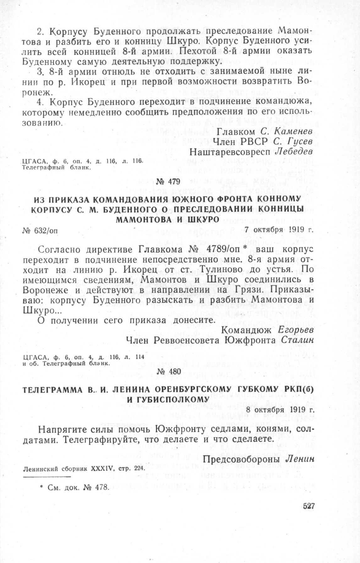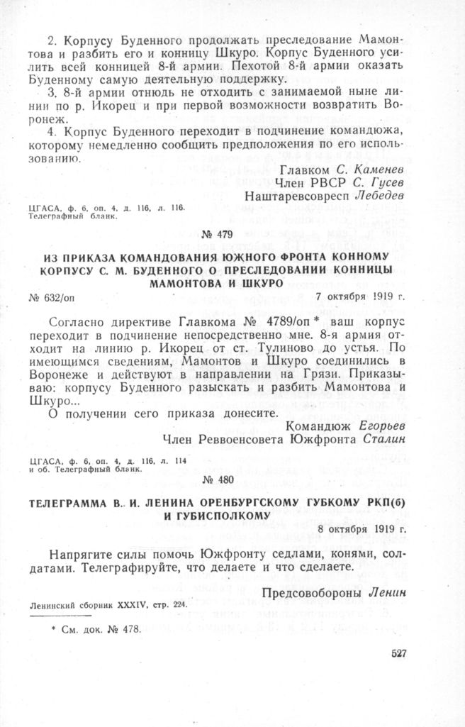 Из приказа командования Южного фронта Конному корпусу С.М. Буденного о преследовании конницы Мамонтова и Шкуро. 7 октября 1919 г. // ЦГАСА, ф. 6 , оп. 4, д. 116, л. 114 и об. Телеграфный бланк.