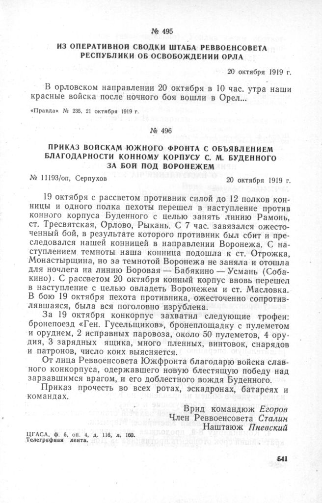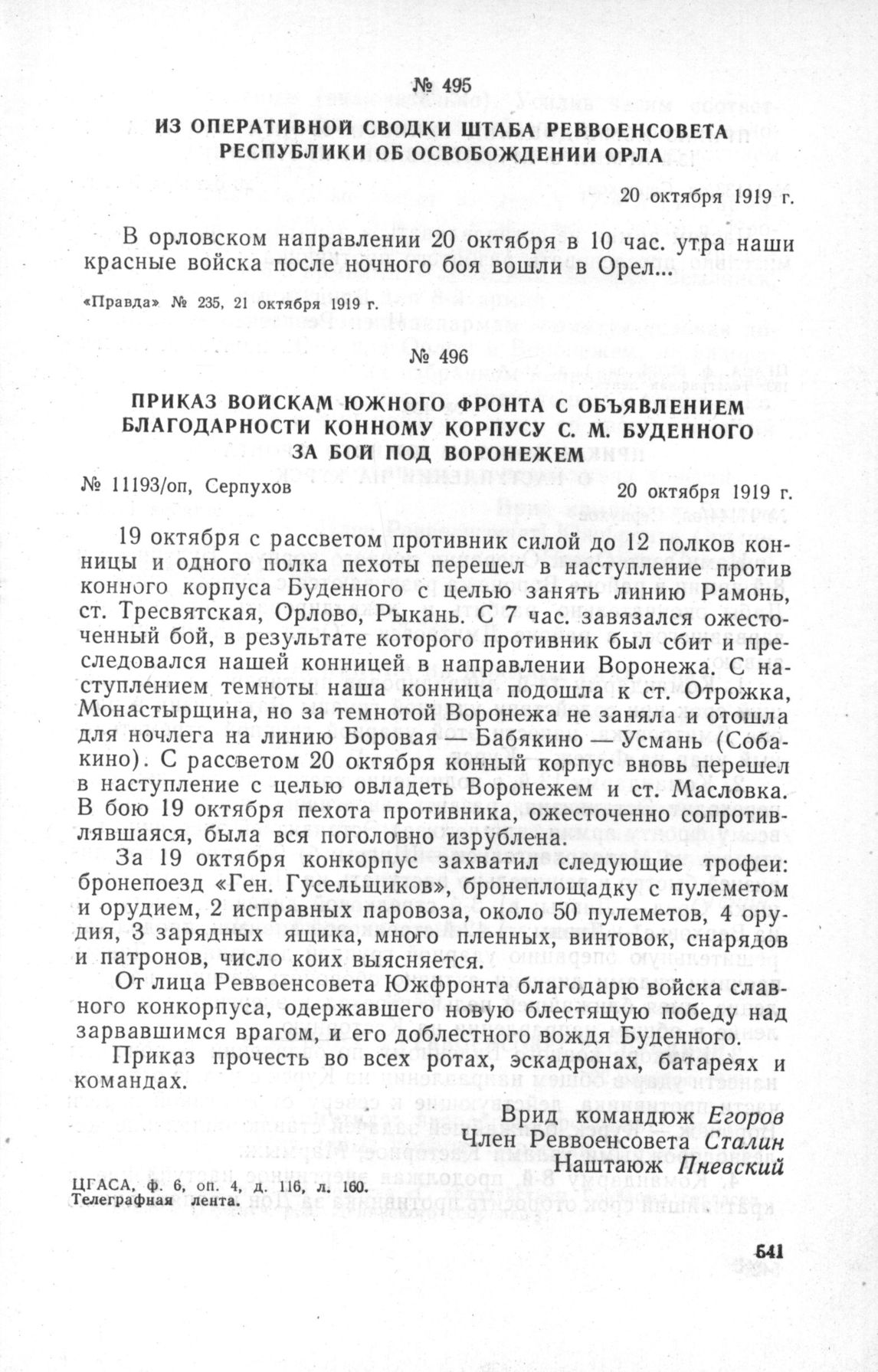 Из оперативной сводки штаба Реввоенсовета Республики об освобождении Орла. 20 октября 1919 г. // «Правда» № 235, 21 октября 1919 г.