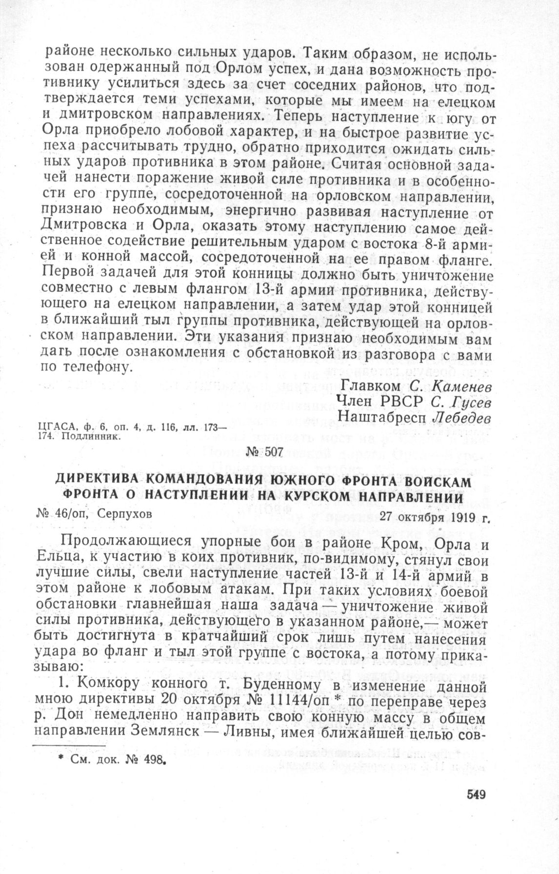 Директива командования Южного фронта войскам фронта о наступлении на курском направлении. Серпухов, 27 октября 1919 г.