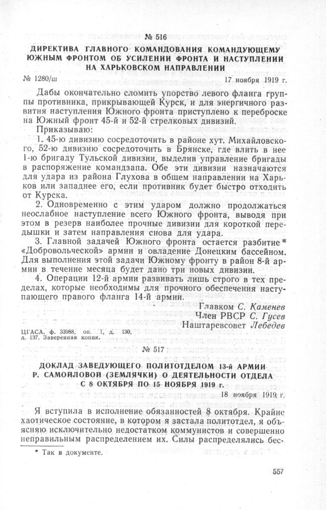 Доклад заведующего Политотделом 13-й армии Р. Самойловой (Землячки) о деятельности отдела с 8 октября по 15 ноября 1919 г. 18 ноября 1919 г. // ЦГАСА, ф. 83/198, оп. 1, д. 9, лл. 320-321. Подлинник.