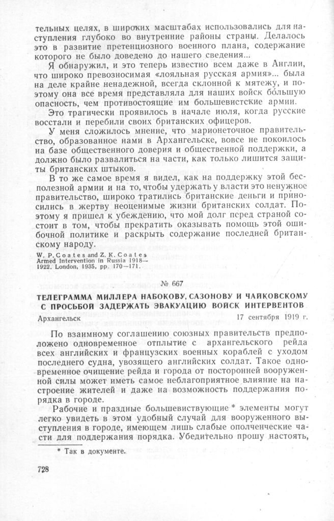 Телеграмма Миллера Набокову, Сазонову и Чайковскому с просьбой задержать эвакуацию войск интервентов. Архангельск, 17 сентября 1919 г. // ЦГАОР СССР, ф. 17, оп. 1, д, 16, л. 132 и об. Копия.