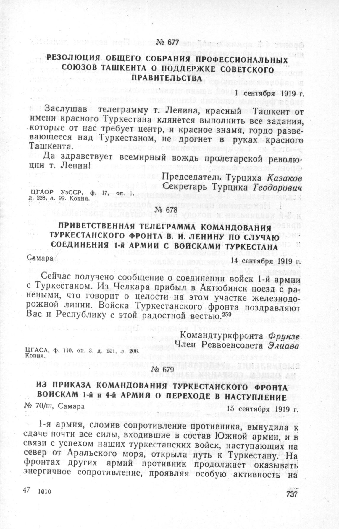 Из приказа командования Туркестанского фронта войскам 1-й и 4-й армий о переходе в наступление. Самара, 15 сентября 1919 г. // ЦГАСА, ф. 106. оп. 3, д. 141, лл. 37-38. Копия.