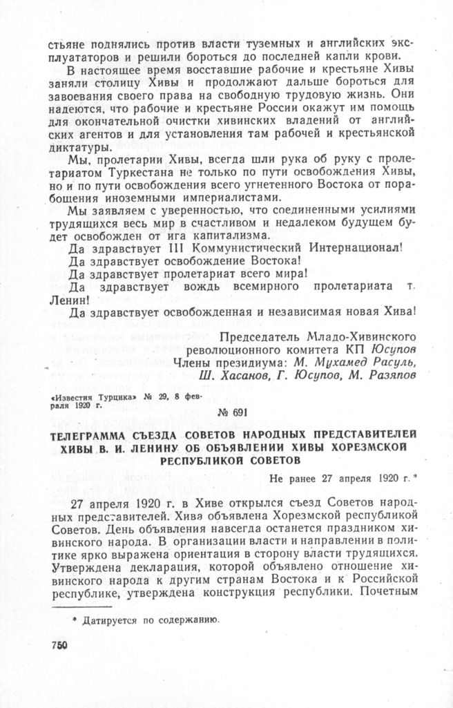 Телеграмма Съезда Советов народных представителей Хивы В.И. Ленину об объявлении Хивы Хорезмской Республикой Советов. Не ранее 27 апреля 1920 г. // Партархив Института истории партии при ЦК КП Узбекистана, ф. 617, оп. 2, д. 311, лл. 231-232. Копия.