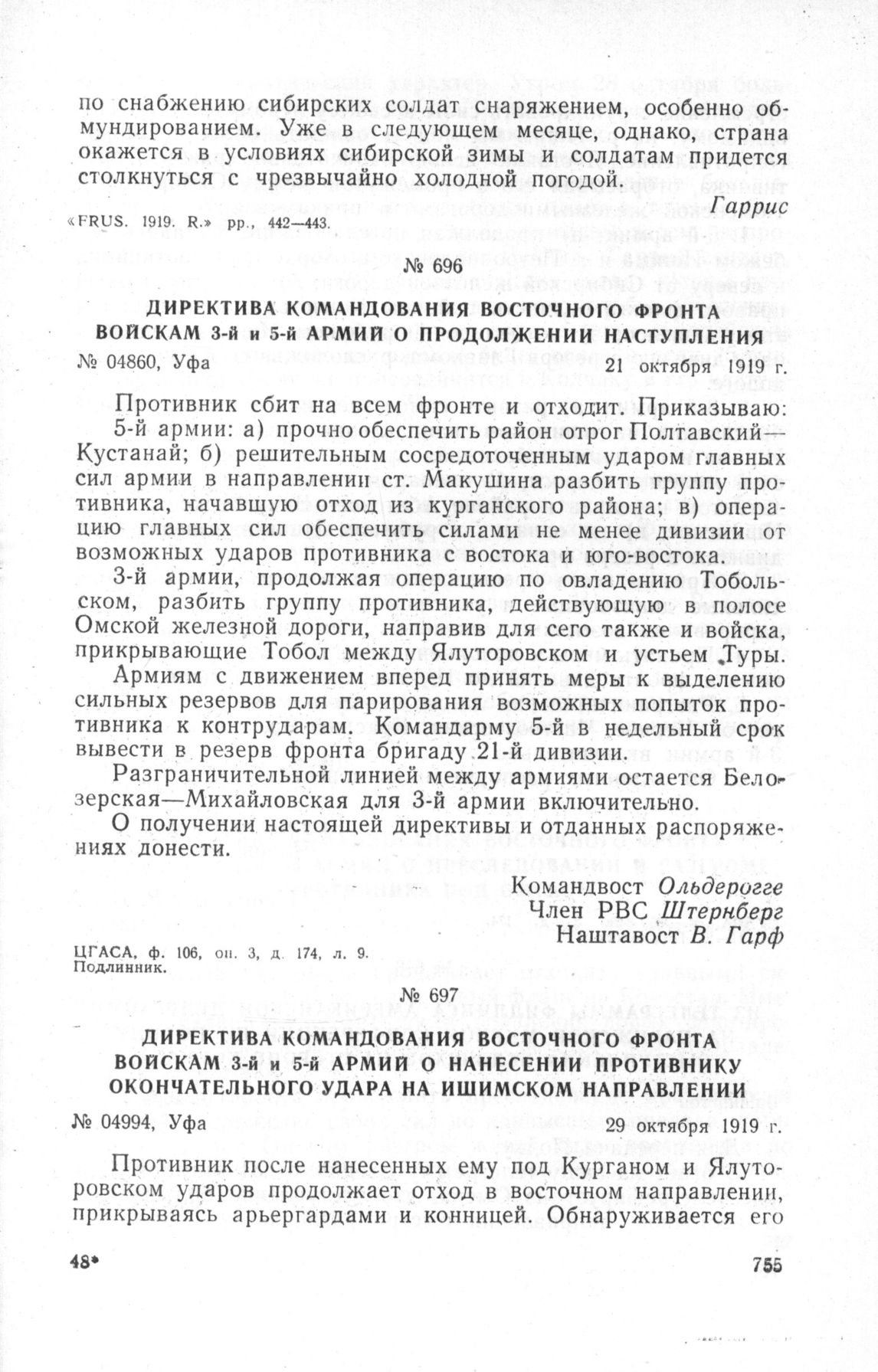 Директива командования Восточного фронта войскам 3-й и 5-й армий о продолжении наступления. Уфа, 21 октября 1919 г. // ЦГАСА, ф. 106, оп. 3, д. 174, л. 9. Подлинник.