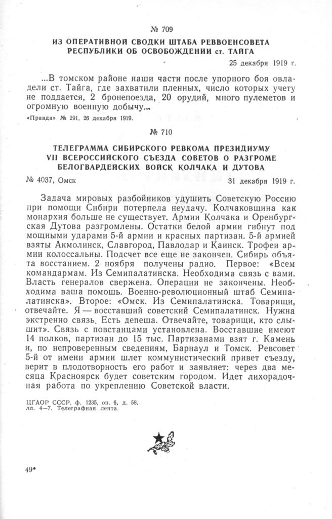 Из оперативной сводки штаба Реввоенсовета Республики об освобождении ст. Тайга. 25 декабря 1919 г. // «Правда» № 291, 26 декабря 1919.