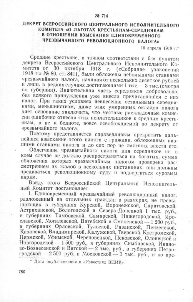 Декрет Всероссийского Центрального Исполнительного Комитета «О льготах крестьянам-середнякам в отношении взыскания единовременного чрезвычайного революционного налога». 10 апреля 1919 г.