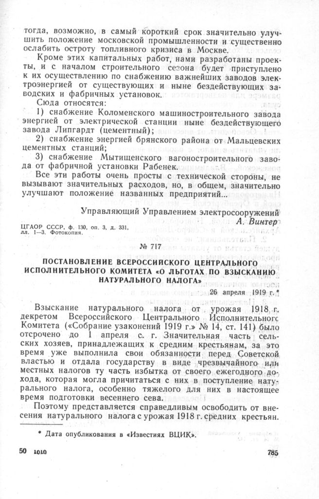 Постановление Всероссийского Центрального Исполнительного Комитета «О льготах по взысканию натурального налога». 26 апреля 1919 г. // «Собрание узаконений 1919 г.» № 14, ст. 142.