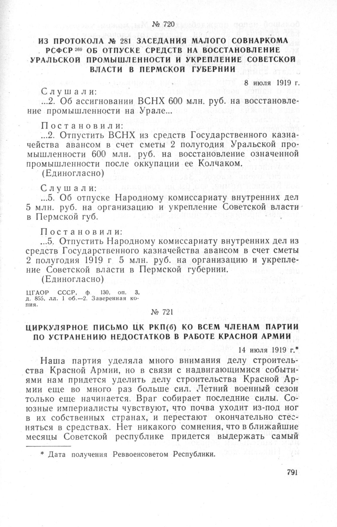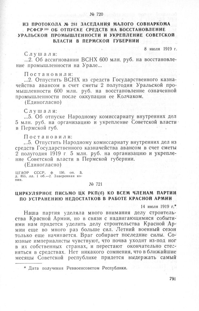 Из протокола № 281 заседания Малого Совнаркома РСФСР об отпуске средств на восстановление уральской промышленности и укрепление Советской власти в Пермской губернии. 8 июля 1919 г. // ЦГАОР СССР, ф. 130, оп. 3, д. 855, лл. 1 об.-2. Заверенная копия.