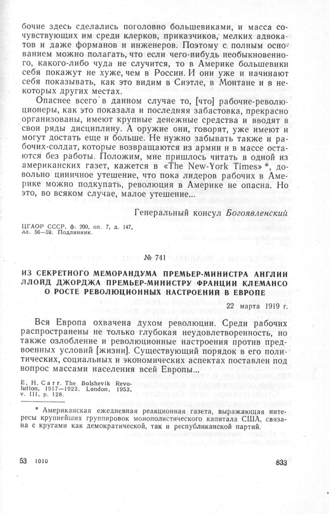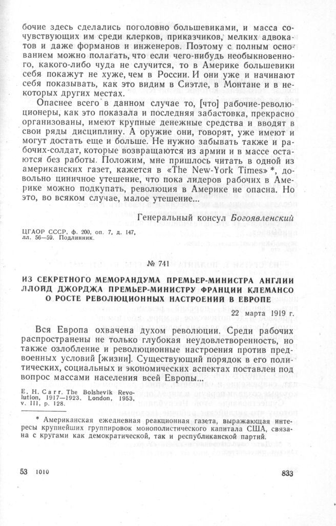 Из секретного меморандума Премьер-министра Англии Ллойд Джорджа Премьер-министру Франции Клемансо о росте революционных настроений в Европе. 22 марта 1919 г. // Е.Н. Сагг. The Bolshevik Revolution, 1917—1923. London, 1953, v. Ill, p. 128.