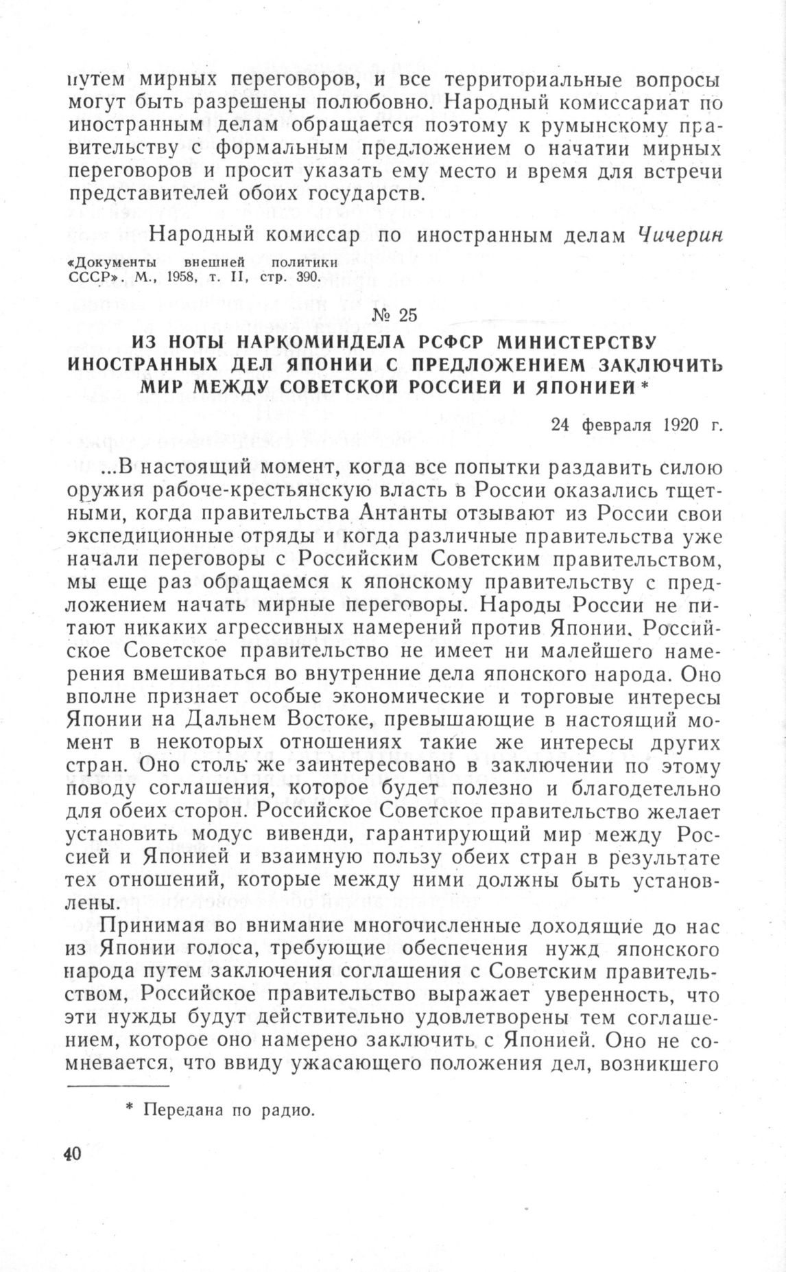 Из ноты Наркоминдела РСФСР Министерству Иностранных Дел Японии с предложением заключить мир между Советской Россией и Японией. 24 февраля 1920 г. // «Документы внешней политики СССР». М., 1958, т. II, стр. 389.