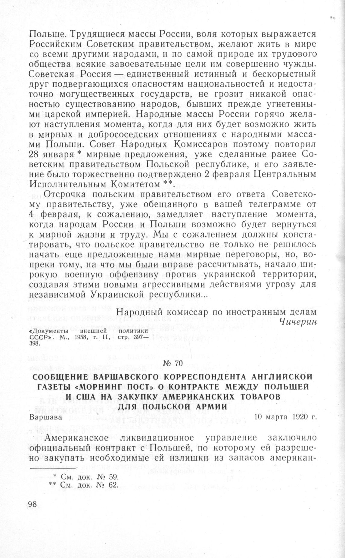 Сообщение варшавского корреспондента английской газеты «Морнинг Пост» о контракте между Польшей и США на закупку американских товаров для польской армии. Варшава, 10 марта 1920 г. // W.Р. Соatеs and Z.К. Соatеs. «Armed Intervention in Russia, 1918—1922». London, 1935, p. 301.