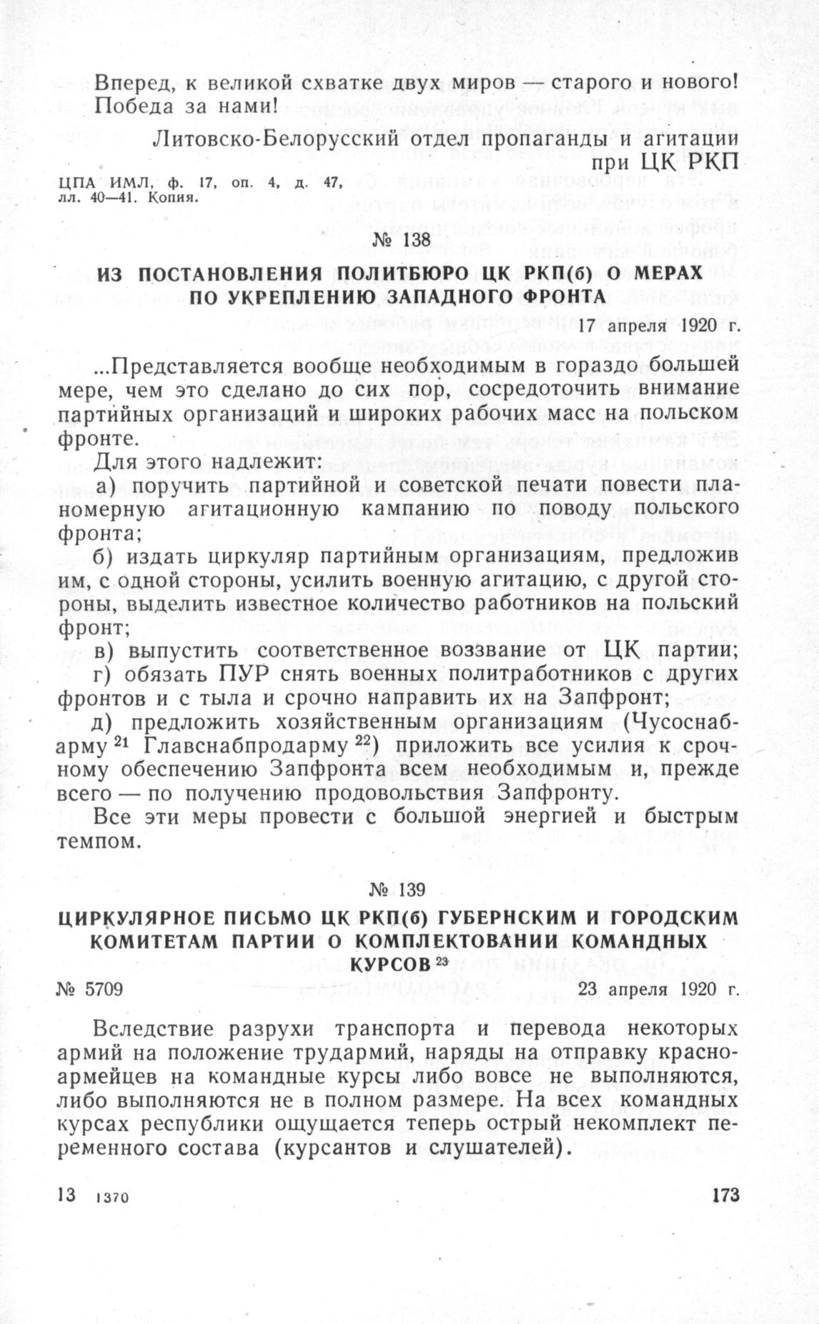 Циркулярное письмо ЦК РКП(б) губернским и городским комитетам партии о комплектовании командных курсов. 23 апреля 1920 г. // ЦПА ИМЛ, ф. 17, оп. 7, д. 196, л. 742. Копия.