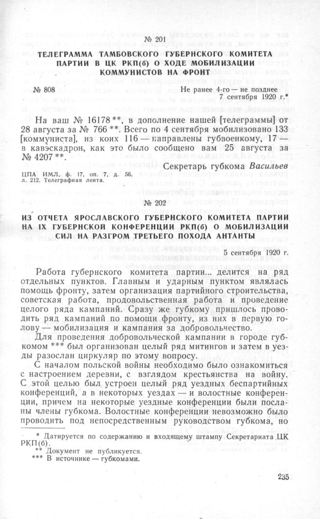 Из отчета Ярославского губернского комитета партии на IX губернской конференции РКП(б) о мобилизации сил на разгром третьего похода Антанты. 5 сентября 1920 г. // «Отчет 9-й губконференции Российской Коммунистической партии Ярославской губернии. 5-7 сентября 1920 г.». Ярославль, 1920, стр. 4-5.