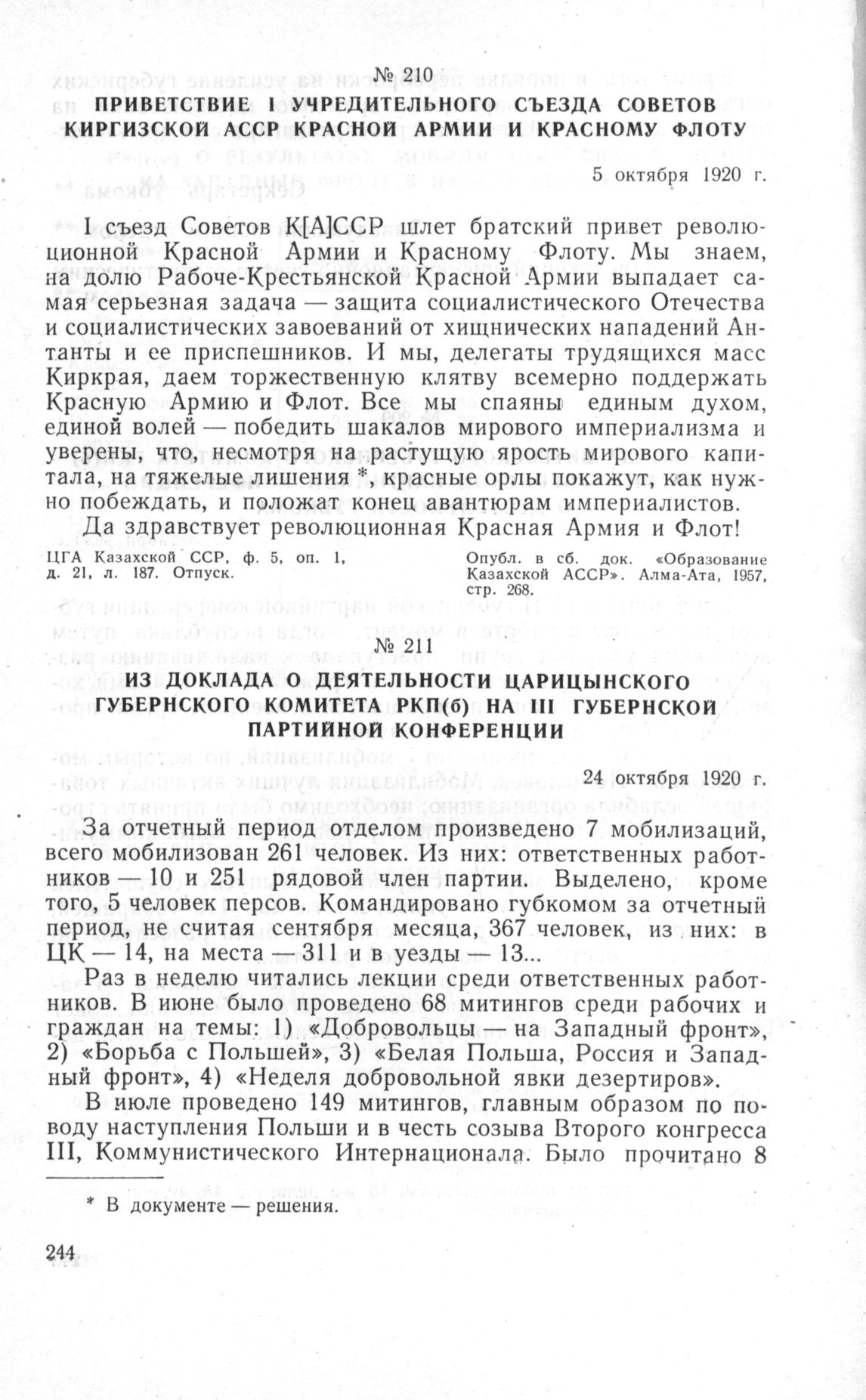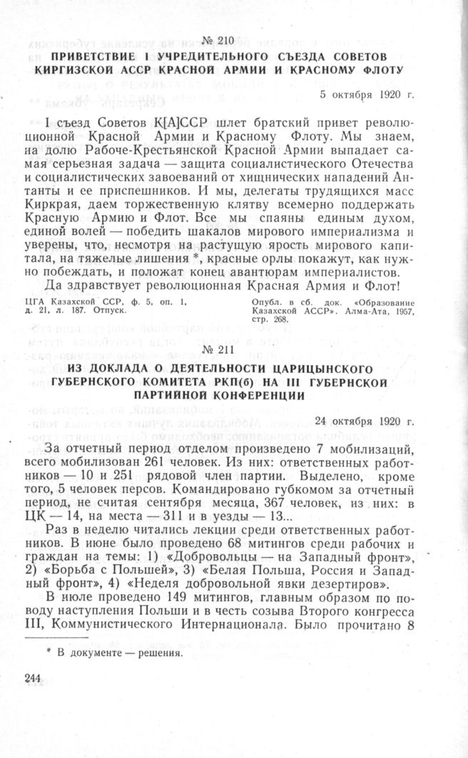 Из доклада о деятельности Царицынского губернского комитета РКП(б) на III губернской партийной конференции. 24 октября 1920 г. // Партархив Сталинградского обкома КПСС, ф. 1, оп. 1, д. 28, л. 83 и об. Копия.