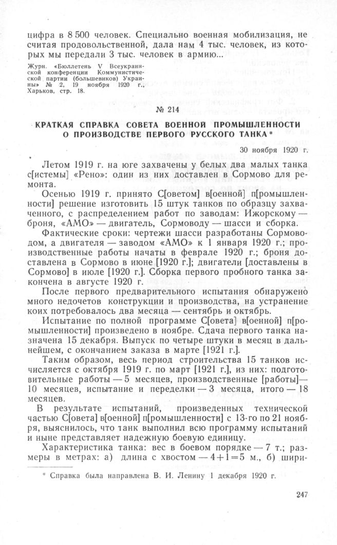 Краткая справка Совета Военной промышленности о производстве первого русского танка. 30 ноября 1920 г.