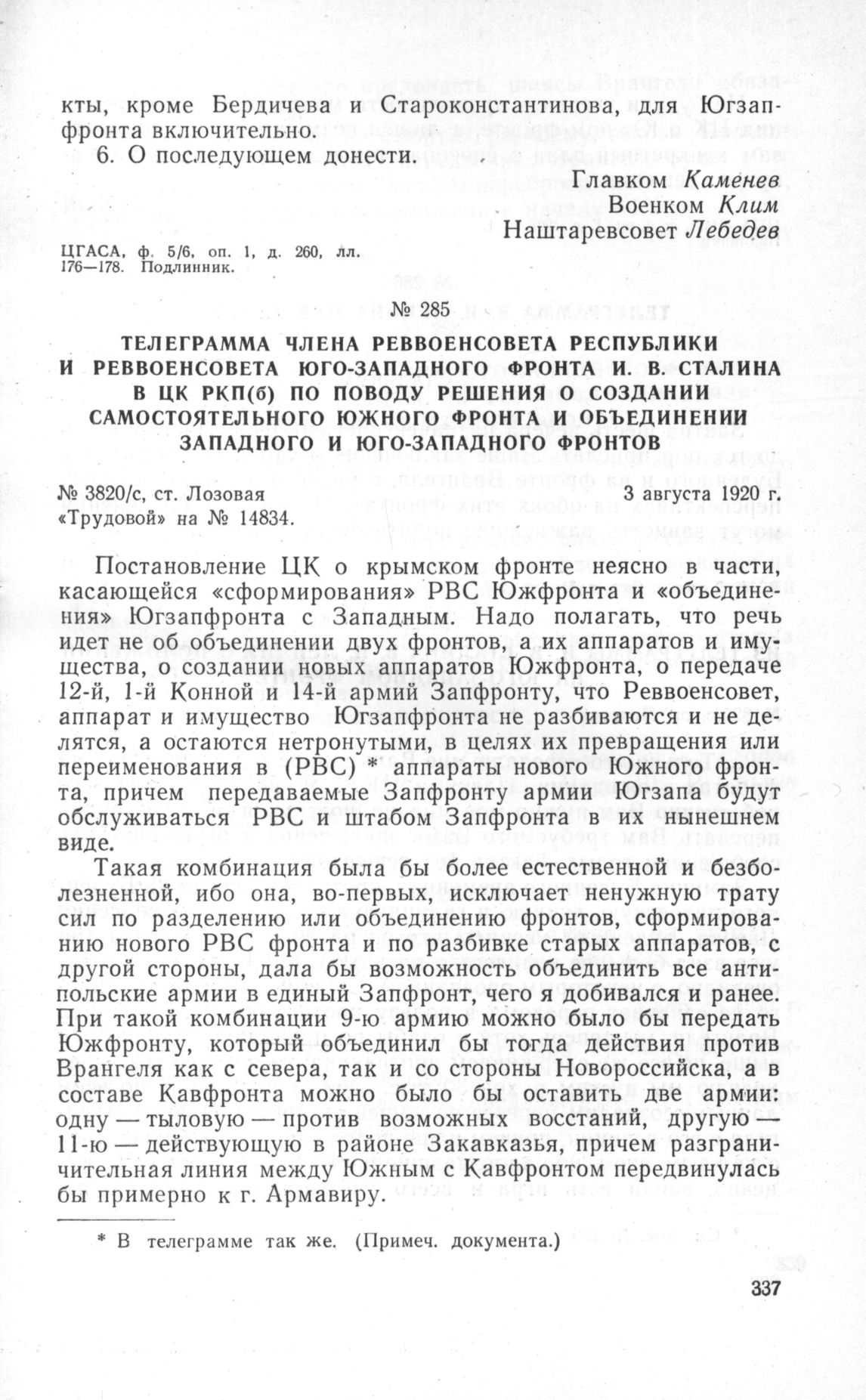 Телеграмма члена Реввоенсовета Республики и Реввоенсовета Юго-Западного фронта И.В. Сталина в ЦК РКП(б) по поводу решения о создании самостоятельного Южного фронта и объединении Западного и Юго-Западного фронтов. ст. Лозовая, 3 августа 1920 г.