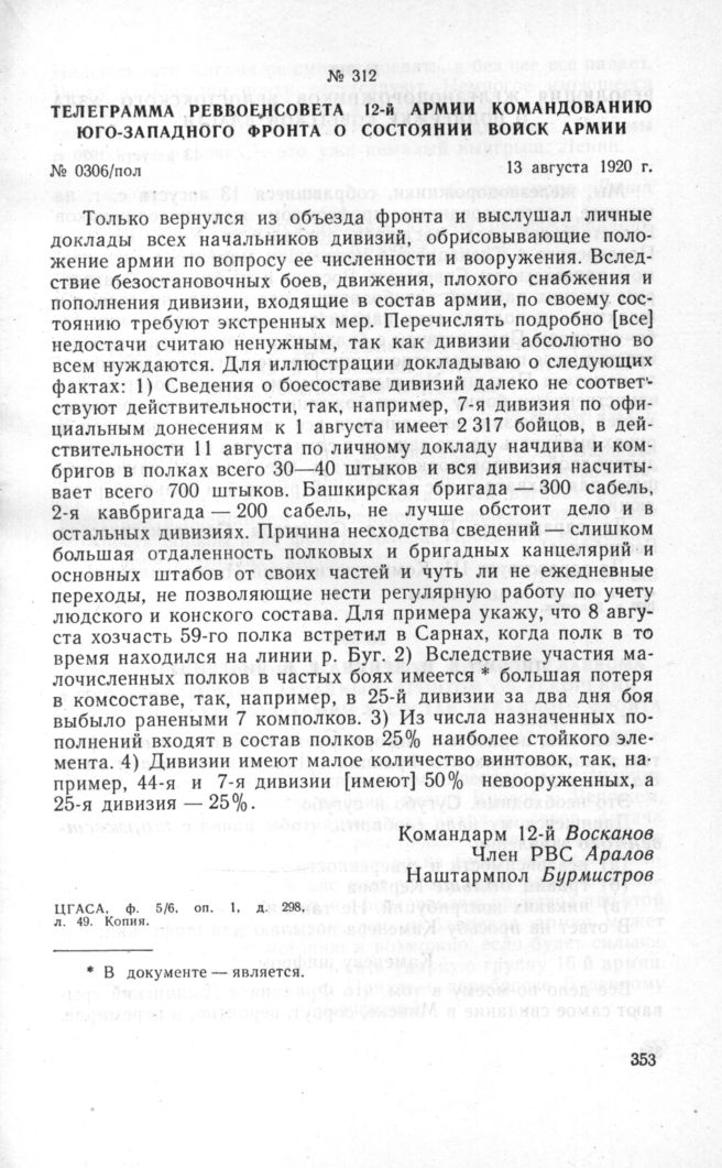 Телеграмма Реввоенсовета 12-й армии командованию Юго-Западного фронта о состоянии войск армии. 13 августа 1920 г. // ЦГАСА, ф. 5/6. оп. 1, д. 298. л. 49. Копия.