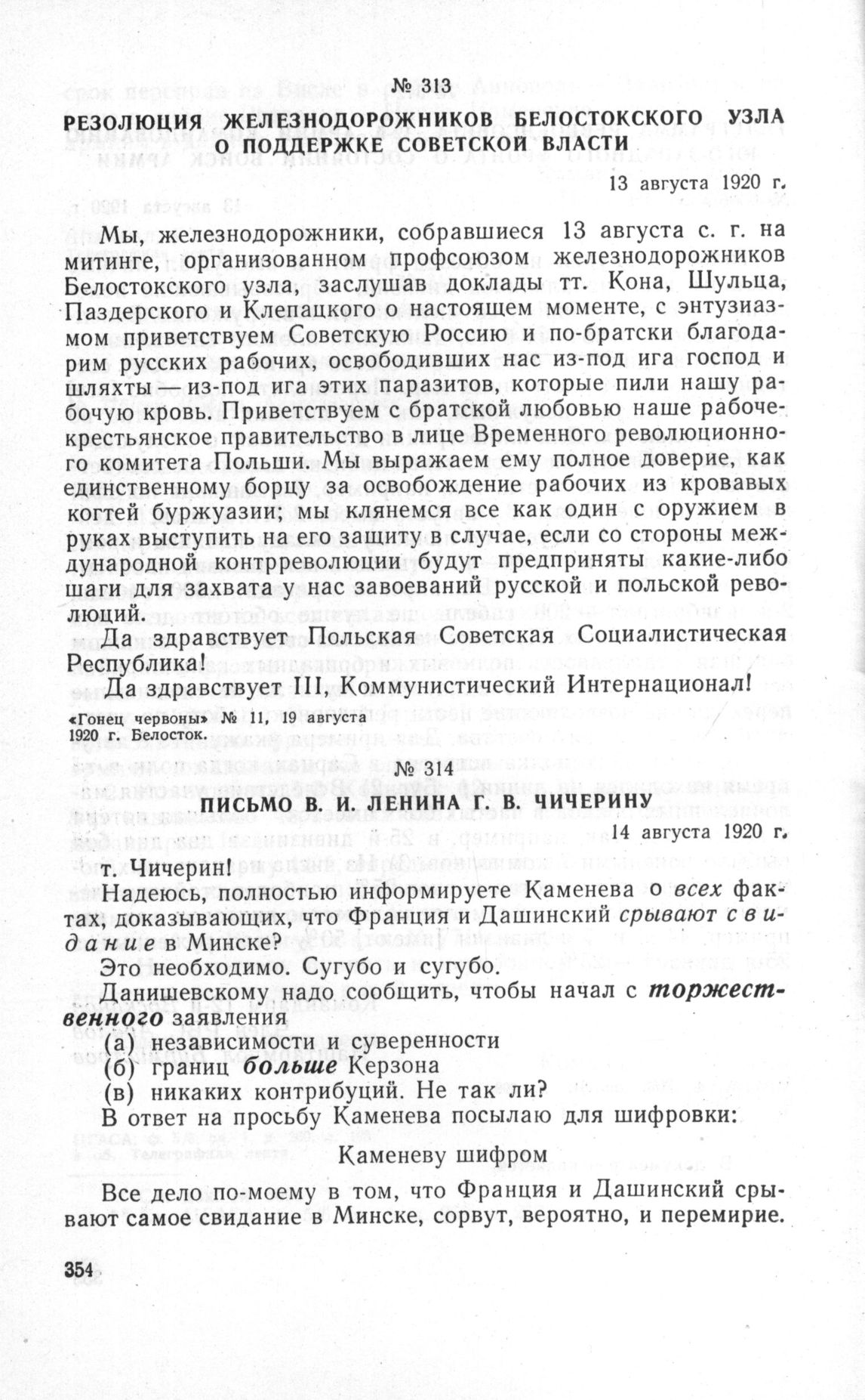 Резолюция железнодорожников Белостокского узла о поддержке Советской власти. 13 августа 1920 г. // «Гонец червоны» № 11, 19 августа 1920 г. Белосток.