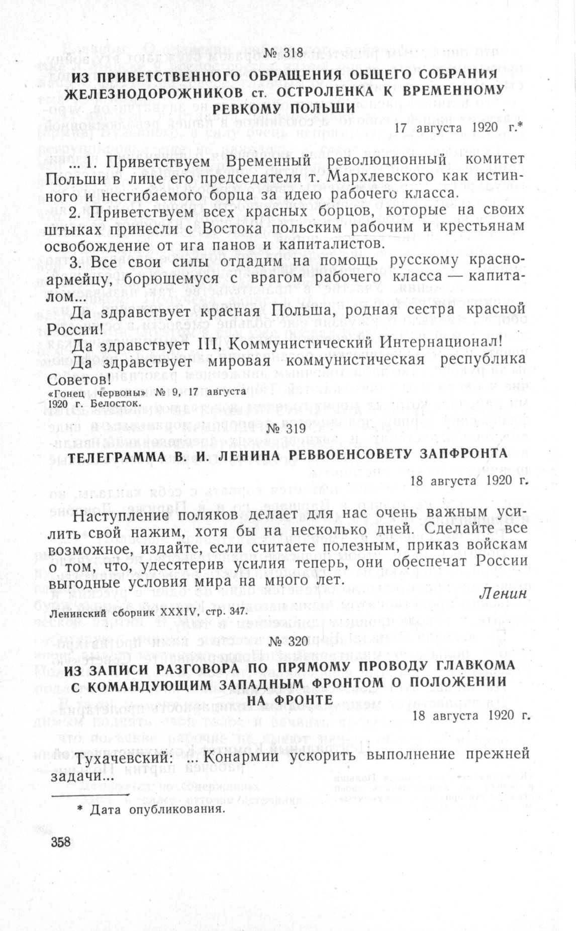 Из записи разговора по прямому проводу Главкома с Командующим Западным фронтом о положении на фронте. 18 августа 1920 г. // ЦГАСА, ф. 6. оп. 4, д. 500, лл. 181, 182, 183-184. Телеграфная лента.