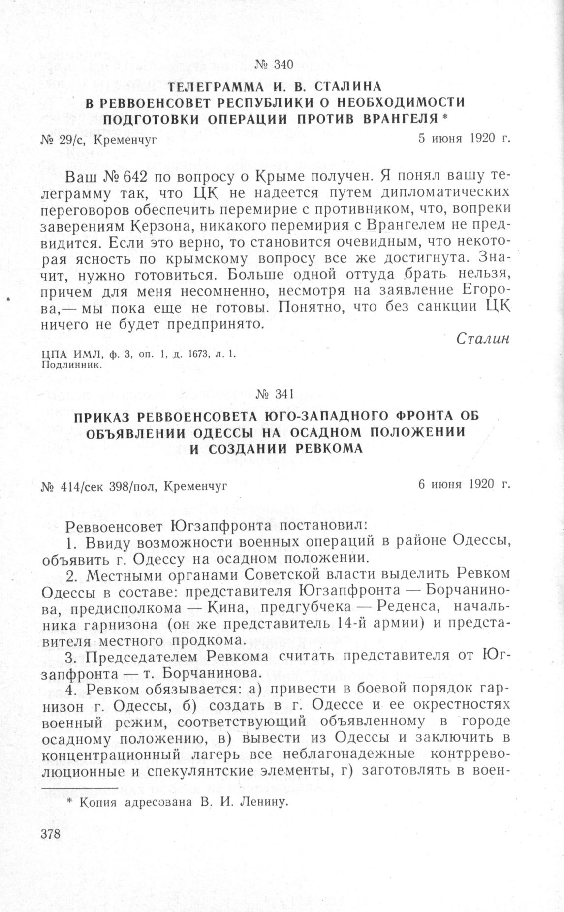 Телеграмма И.В. Сталина в Реввоенсовет Республики о необходимости подготовки операции против Врангеля. Кременчуг, 5 июня 1920 г.