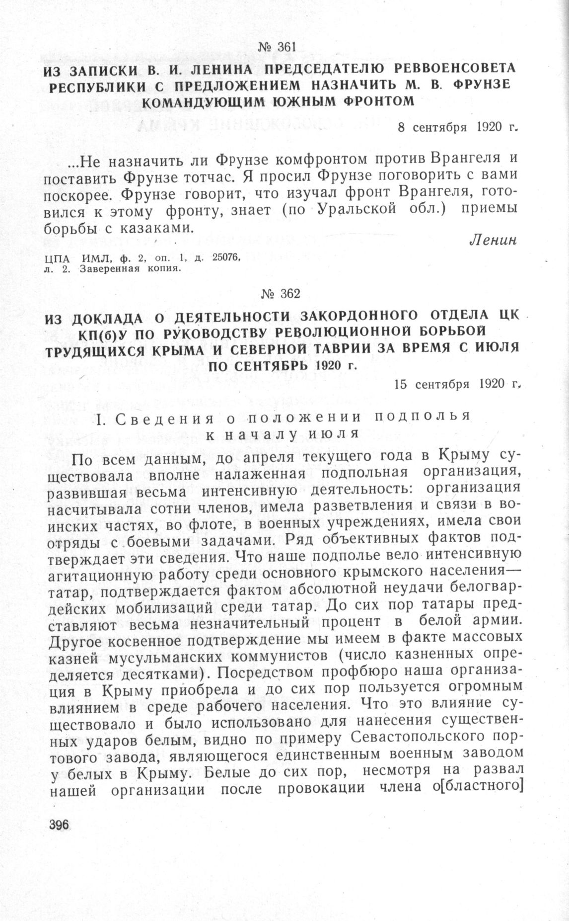 Из записки В.И. Ленина Председателю Реввоенсовета Республики с предложением назначить М.В. Фрунзе Командующим Южным фронтом. 8 сентября 1920 г. // ЦПА ИМЛ, ф. 2, оп. 1, д. 25076, л. 2. Заверенная копия.