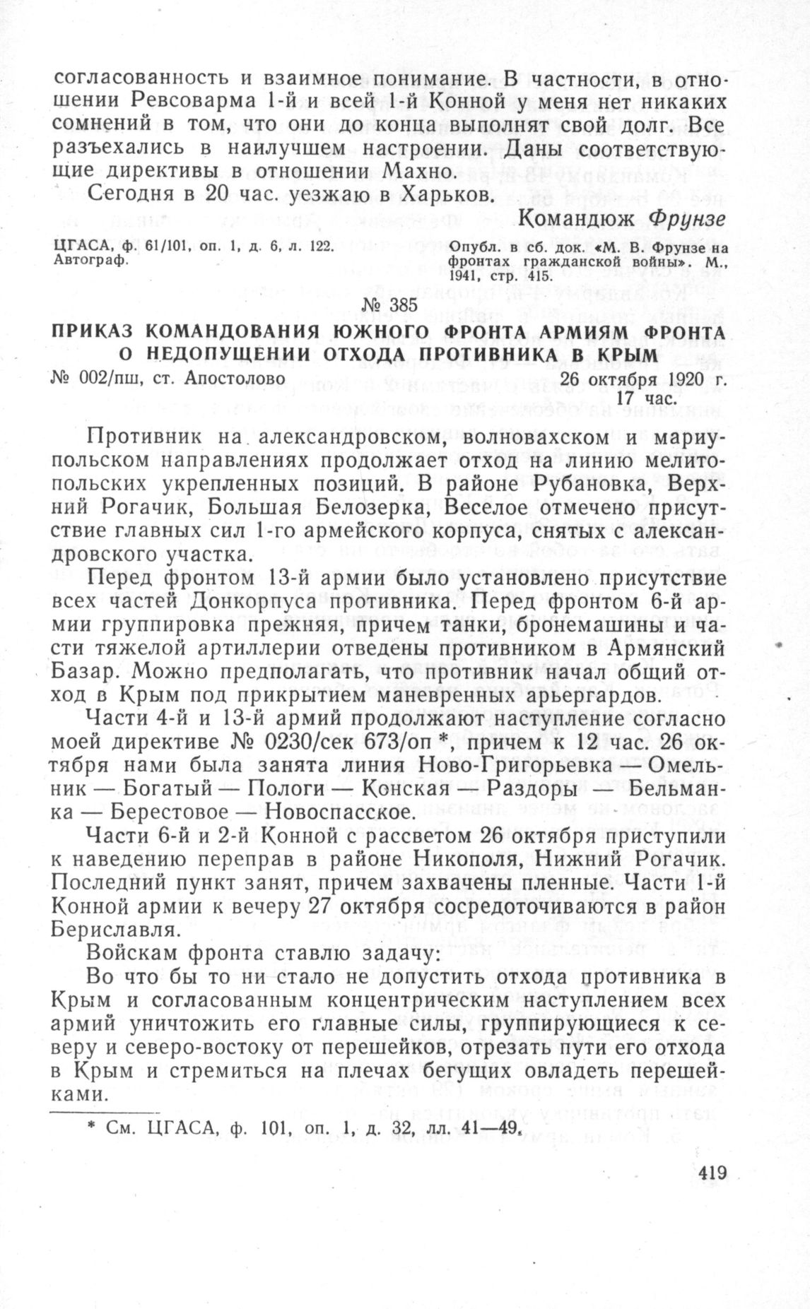 Приказ Командования Южного фронта армиям фронта о недопущении отхода противника в Крым. ст. Апостолово, 26 октября 1920 г. // ЦГАСА, ф. 101, оп. 1, д. 32. лл. 34-37. Подлинник. Опубл. в сб. док. «М.В. Фрунзе на фронтах гражданской войны». М., 1941, стр. 413-414.