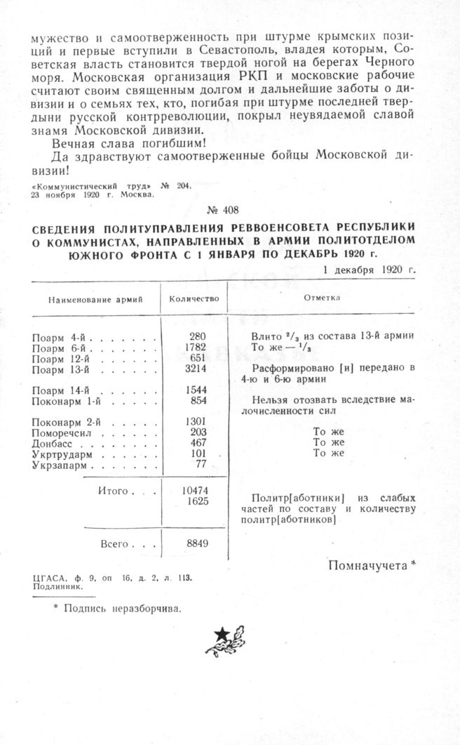 Сведения Политуправления Реввоенсовета Республики о коммунистах, направленных в армии Политотделом Южного фронта с 1 января по декабрь 1920 г. 1 декабря 1920 г. // ЦГАСА, ф. 9, оп. 16, д. 2, л. 113. Подлинник.